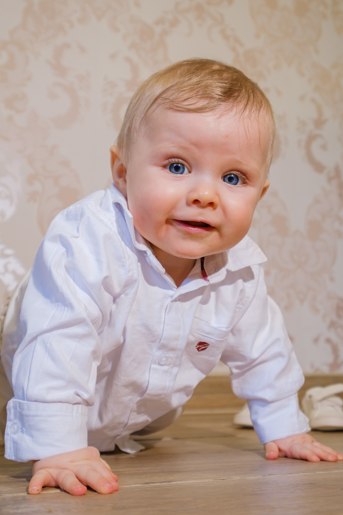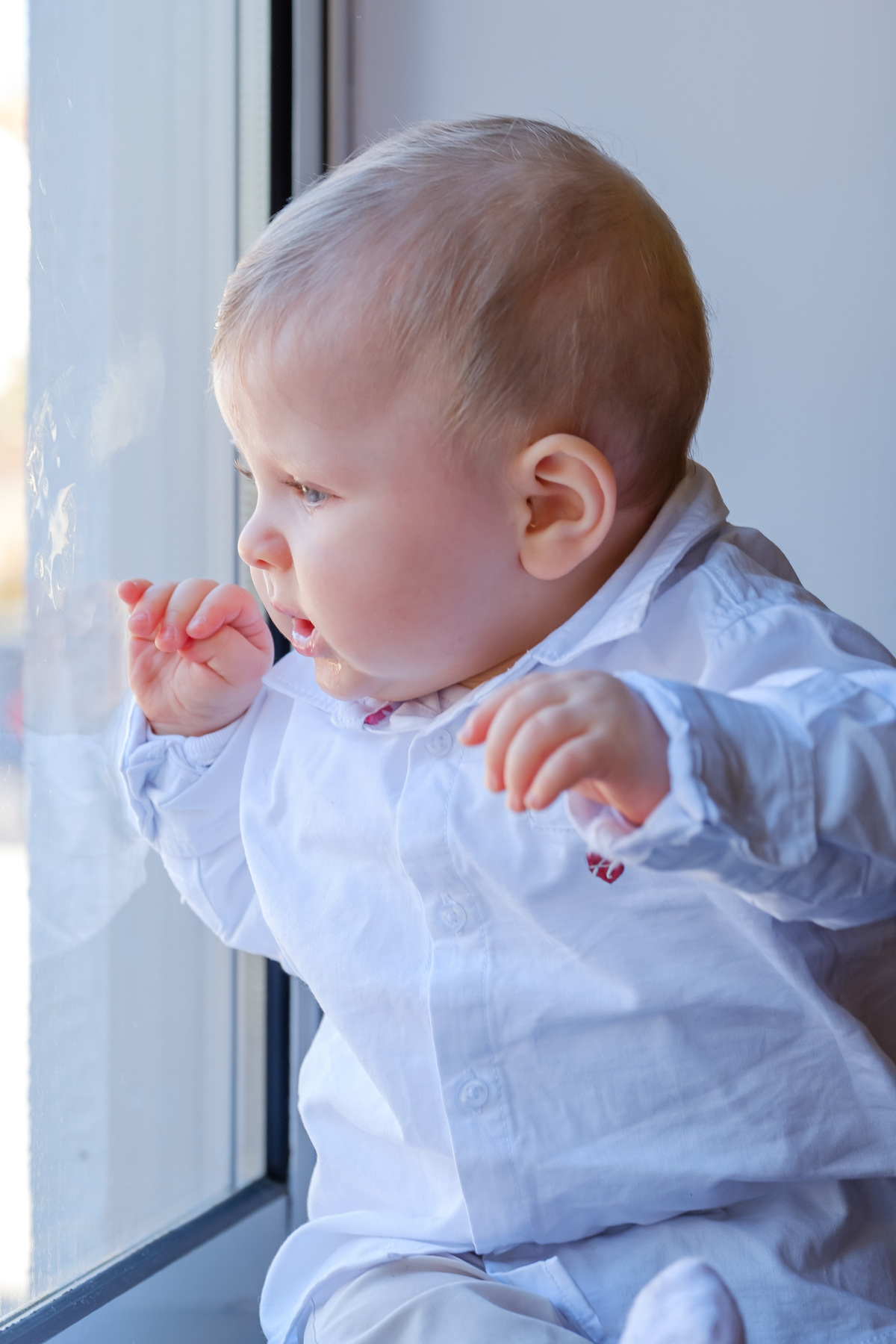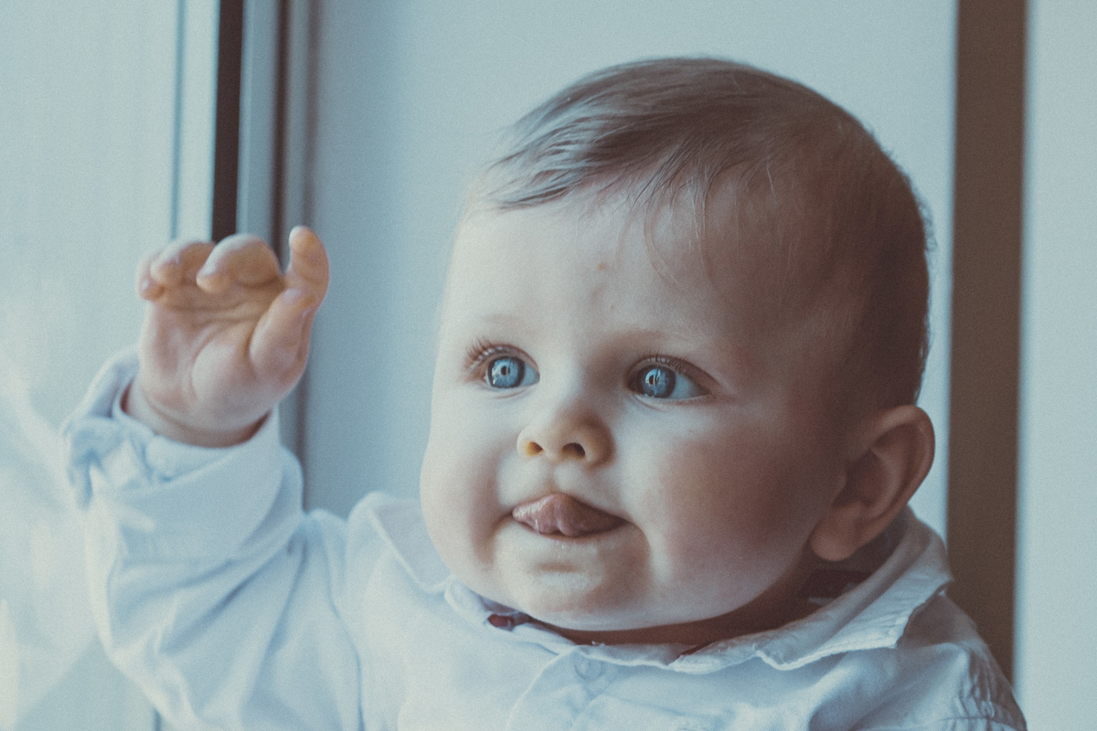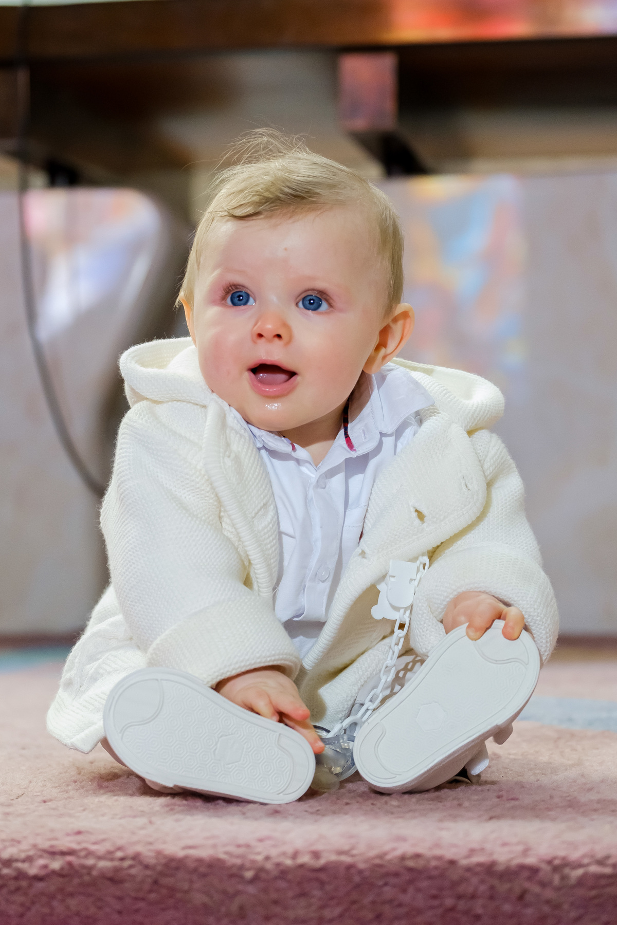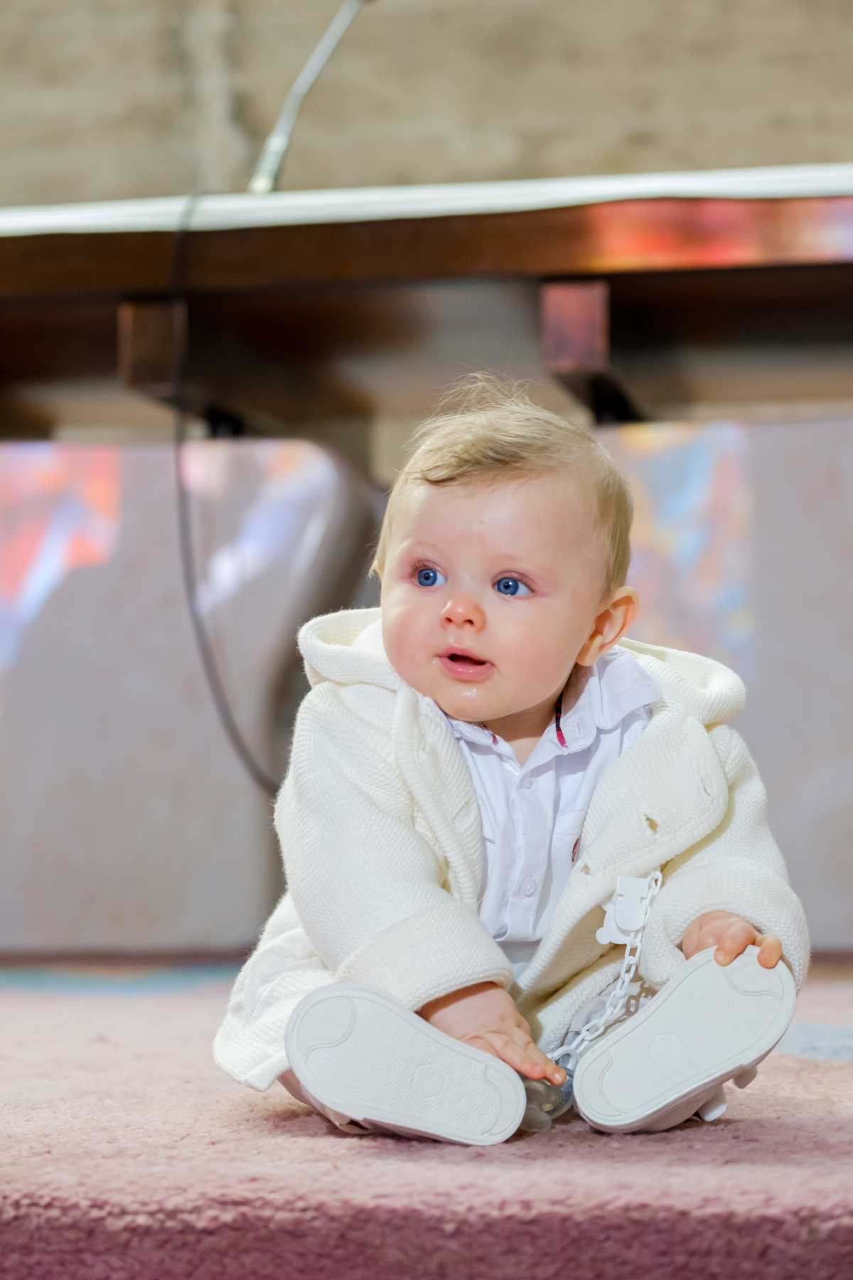 Sessão fotográfica do batismo de Nelson Daniel, um menino de olhos grandes azuis muito curiosos por ver o mundo ainda por explorar.